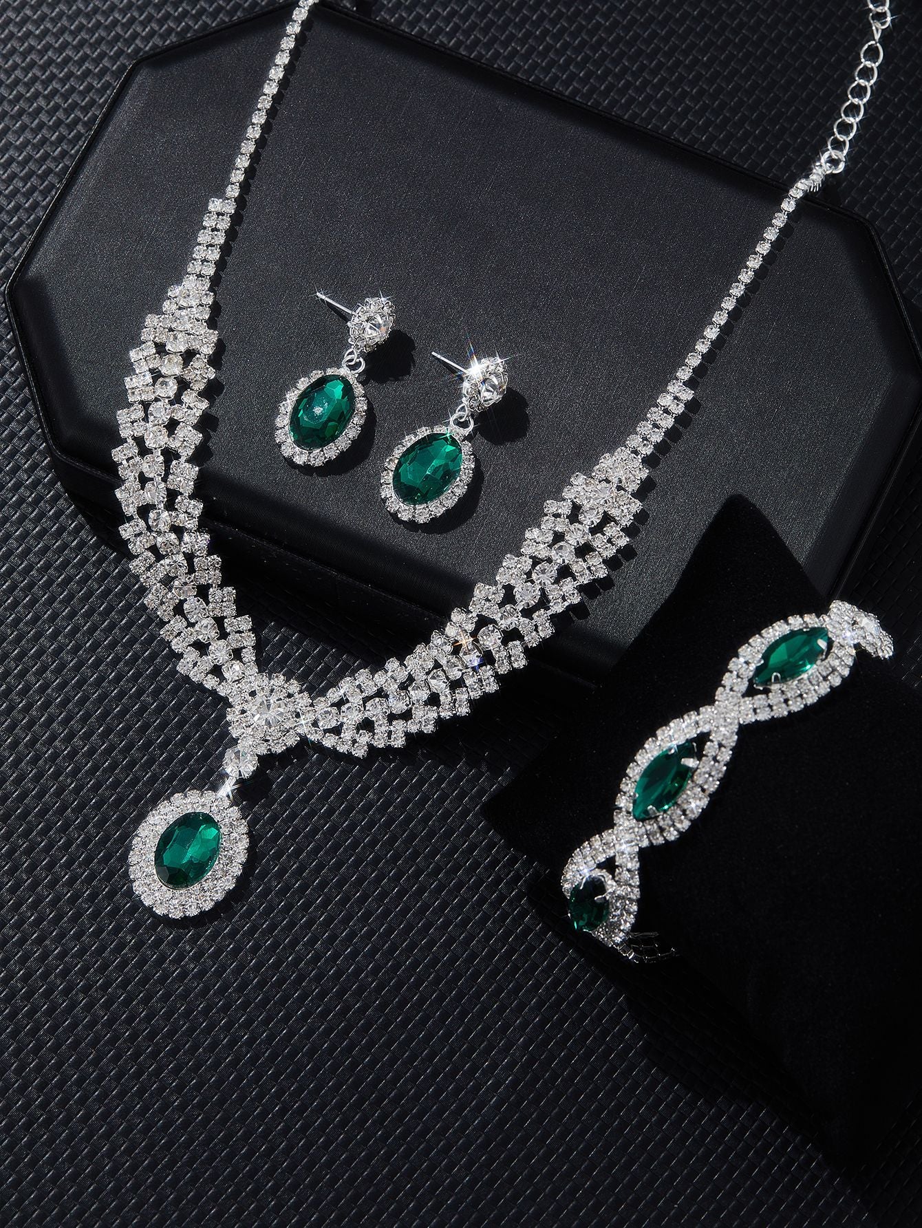 Product information: Pattern: Plants and Flowers Colors: Black, Blue, Red, Green Target Audience: Women Pendant Material: Rhinestones Style: Jewelry Set Material: Alloy Set Includes: Earrings + Necklace + Bracelet